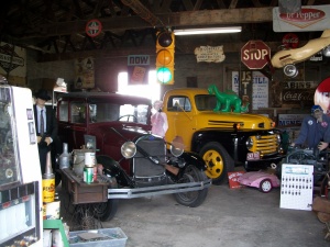Une fois sortis du bureau d'autres photos sont prises à sa demande avec le drapeau de la 66 tenu par nos soins, nous les quatre jeunes voyageurs du lundi. Le couple reprend la route et Gary nous réserve quelques dernières surprises en nous conduisant dans un vieux garage où sont entreposées deux autres vieilles voitures et des mannequins dont deux qui représentent Bony & Clyde. Le vieil homme propose une bouteille de soda estampillée route 66 et demande à Caro de prendre place dans la voiture à coté de Bonny pour la photo. Puis de s'asseoir sur le pare choc avec un chapeau sur la tête et la main posée sur un fusil et enfin à coté de Clyde la main sur une épaule en buvant son soda. Tout cela sous le regard de Hurl un autre mannequin qui regarde la scène bêtement (voir sur le site de Gary le mannequin mécanicien).