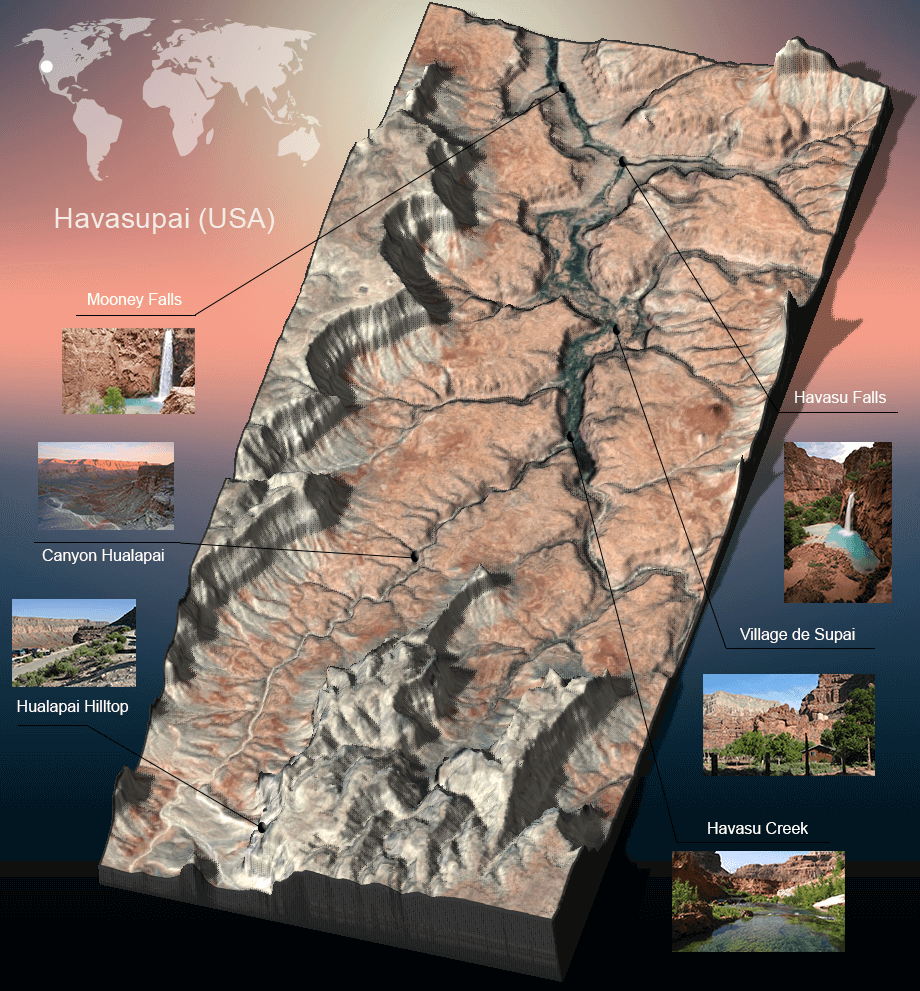 La réserve Indienne d’Havasupai est située dans le secteur le plus à l’ouest du Grand Canyon (à 200 miles/320 km de Grand Canyon National Park).